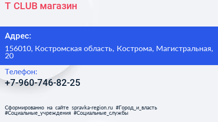 T-CLUB, магазин по адресу 156010, Костромская область, Кострома, Магистральная, 20 в дальнейшем Организация, размещена в следующих категориях:
