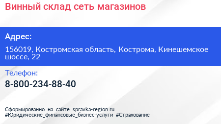 Винный склад, сеть магазинов по адресу 156019, Костромская область, Кострома, Кинешемское шоссе, 22 в дальнейшем Организация, размещена в следующих категориях: