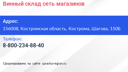 Винный склад, сеть магазинов по адресу 156008, Костромская область, Кострома, Шагова, 150Б в дальнейшем Организация, размещена в следующих категориях: