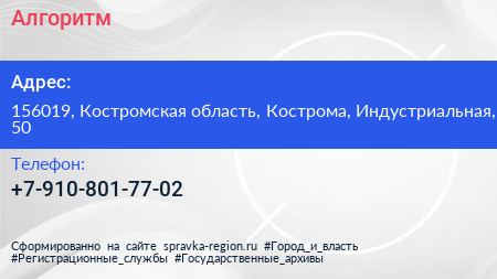 Алгоритм по адресу 156019, Костромская область, Кострома, Индустриальная, 50 в дальнейшем Организация, размещена в следующих категориях: