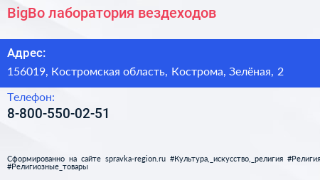 BigBo, лаборатория вездеходов по адресу 156019, Костромская область, Кострома, Зелёная, 2 в дальнейшем Организация, размещена в следующих категориях:
