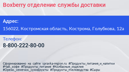 Boxberry, отделение службы доставки по адресу 156022, Костромская область, Кострома, Голубкова, 12а в дальнейшем Организация, размещена в следующих категориях: