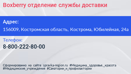 Boxberry, отделение службы доставки по адресу 156009, Костромская область, Кострома, Юбилейная, 24а в дальнейшем Организация, размещена в следующих категориях: