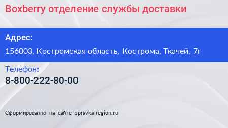 Boxberry, отделение службы доставки по адресу 156003, Костромская область, Кострома, Ткачей, 7г в дальнейшем Организация, размещена в следующих категориях: