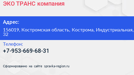 ЭКО-ТРАНС, компания по адресу 156019, Костромская область, Кострома, Индустриальная, 32 в дальнейшем Организация, размещена в следующих категориях: