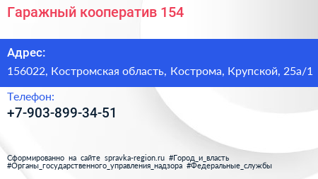 Гаражный кооператив №154 по адресу 156022, Костромская область, Кострома, Крупской, 25а/1 в дальнейшем Организация, размещена в следующих категориях:
