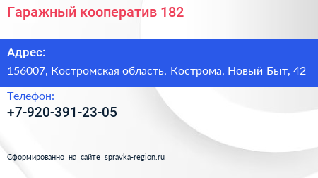 Гаражный кооператив №182 по адресу 156007, Костромская область, Кострома, Новый Быт, 42 в дальнейшем Организация, размещена в следующих категориях: