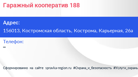 Гаражный кооператив №188 по адресу 156013, Костромская область, Кострома, Карьерная, 26а в дальнейшем Организация, размещена в следующих категориях: