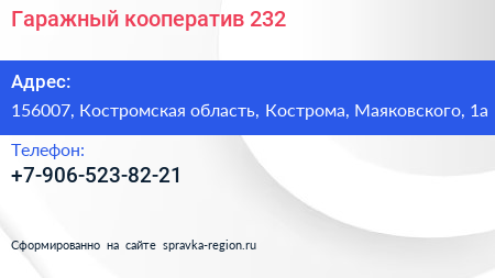 Гаражный кооператив №232 по адресу 156007, Костромская область, Кострома, Маяковского, 1а в дальнейшем Организация, размещена в следующих категориях: