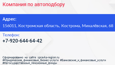 Компания по автоподбору по адресу 156011, Костромская область, Кострома, Михалёвская, 68 в дальнейшем Организация, размещена в следующих категориях: