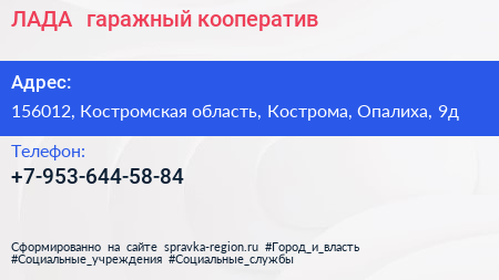 ЛАДА+, гаражный кооператив по адресу 156012, Костромская область, Кострома, Опалиха, 9д в дальнейшем Организация, размещена в следующих категориях: