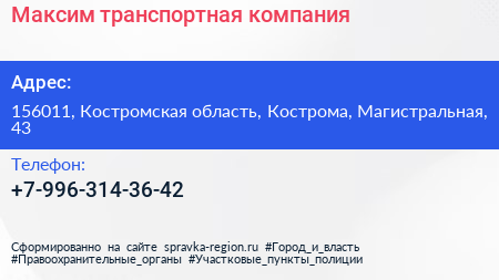 Максим, транспортная компания по адресу 156011, Костромская область, Кострома, Магистральная, 43 в дальнейшем Организация, размещена в следующих категориях: