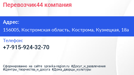 Перевозчик44, компания по адресу 156005, Костромская область, Кострома, Кузнецкая, 18а в дальнейшем Организация, размещена в следующих категориях: