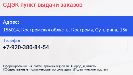 СДЭК, пункт выдачи заказов по адресу 156014, Костромская область, Кострома, Сутырина, 15а в дальнейшем Организация, размещена в следующих категориях: