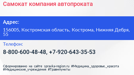 Самокат, компания автопроката по адресу 156005, Костромская область, Кострома, Нижняя Дебря, 55 в дальнейшем Организация, размещена в следующих категориях: