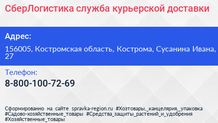 СберЛогистика, служба курьерской доставки по адресу 156005, Костромская область, Кострома, Сусанина Ивана, 27 в дальнейшем Организация, размещена в следующих категориях: