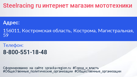 Steelracing.ru, интернет-магазин мототехники по адресу 156011, Костромская область, Кострома, Магистральная, 59 в дальнейшем Организация, размещена в следующих категориях: