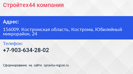 Стройтех44, компания по адресу 156009, Костромская область, Кострома, Юбилейный микрорайон, 24 в дальнейшем Организация, размещена в следующих категориях: