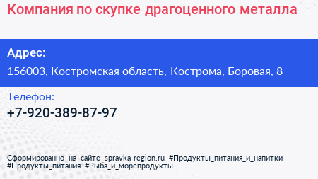 Компания по скупке драгоценного металла по адресу 156003, Костромская область, Кострома, Боровая, 8 в дальнейшем Организация, размещена в следующих категориях: