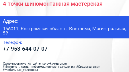 4 точки, шиномонтажная мастерская по адресу 156011, Костромская область, Кострома, Магистральная, 59 в дальнейшем Организация, размещена в следующих категориях: