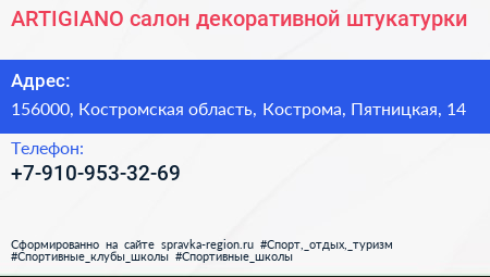 ARTIGIANO, салон декоративной штукатурки по адресу 156000, Костромская область, Кострома, Пятницкая, 14 в дальнейшем Организация, размещена в следующих категориях: