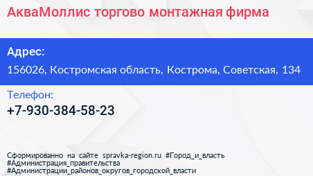АкваМоллис, торгово-монтажная фирма по адресу 156026, Костромская область, Кострома, Советская, 134 в дальнейшем Организация, размещена в следующих категориях: