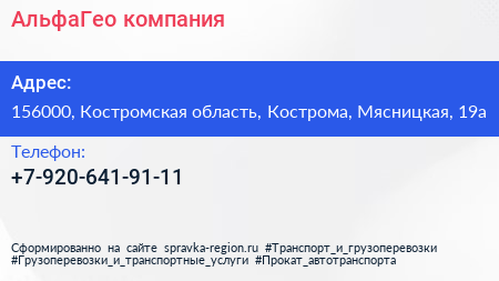 АльфаГео, компания по адресу 156000, Костромская область, Кострома, Мясницкая, 19а в дальнейшем Организация, размещена в следующих категориях:
