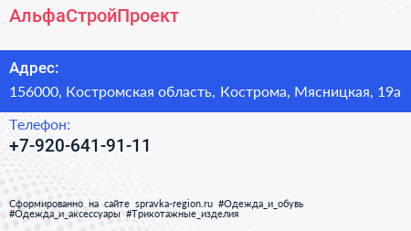 АльфаСтройПроект по адресу 156000, Костромская область, Кострома, Мясницкая, 19а в дальнейшем Организация, размещена в следующих категориях: