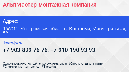 АльпМастер, монтажная компания по адресу 156011, Костромская область, Кострома, Магистральная, 59 в дальнейшем Организация, размещена в следующих категориях: