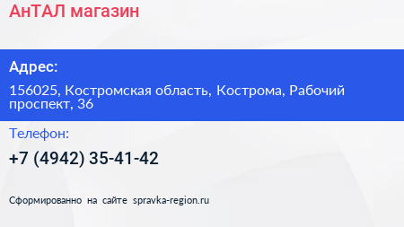 АнТАЛ, магазин по адресу 156025, Костромская область, Кострома, Рабочий проспект, 36 в дальнейшем Организация, размещена в следующих категориях: