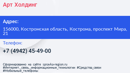 Арт-Холдинг по адресу 156000, Костромская область, Кострома, проспект Мира, 21 в дальнейшем Организация, размещена в следующих категориях:
