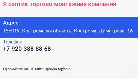 Я.септик, торгово-монтажная компания по адресу 156019, Костромская область, Кострома, Димитрова, 16 в дальнейшем Организация, размещена в следующих категориях: