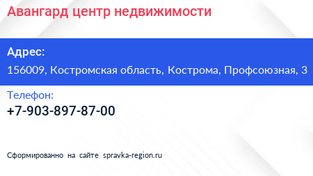 Авангард, центр недвижимости по адресу 156009, Костромская область, Кострома, Профсоюзная, 3 в дальнейшем Организация, размещена в следующих категориях:
