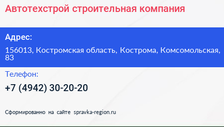 Автотехстрой, строительная компания по адресу 156013, Костромская область, Кострома, Комсомольская, 83 в дальнейшем Организация, размещена в следующих категориях: