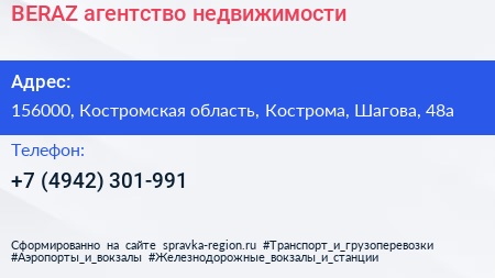 BERAZ, агентство недвижимости по адресу 156000, Костромская область, Кострома, Шагова, 48а в дальнейшем Организация, размещена в следующих категориях: