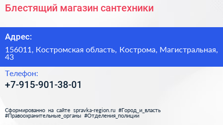 Блестящий, магазин сантехники по адресу 156011, Костромская область, Кострома, Магистральная, 43 в дальнейшем Организация, размещена в следующих категориях: