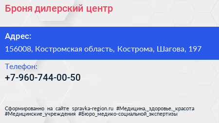 Броня, дилерский центр по адресу 156008, Костромская область, Кострома, Шагова, 197 в дальнейшем Организация, размещена в следующих категориях: