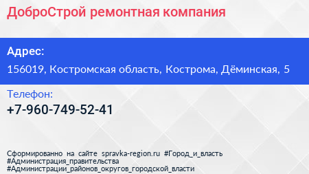 ДоброСтрой, ремонтная компания по адресу 156019, Костромская область, Кострома, Дёминская, 5 в дальнейшем Организация, размещена в следующих категориях: