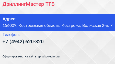 ДриллингМастер.ТГБ по адресу 156009, Костромская область, Кострома, Волжская 2-я, 7 в дальнейшем Организация, размещена в следующих категориях:
