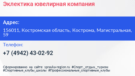 Эклектика, ювелирная компания по адресу 156011, Костромская область, Кострома, Магистральная, 59 в дальнейшем Организация, размещена в следующих категориях: