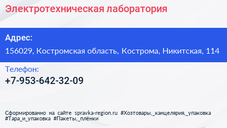 Электротехническая лаборатория по адресу 156029, Костромская область, Кострома, Никитская, 114 в дальнейшем Организация, размещена в следующих категориях: