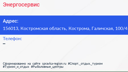 Энергосервис по адресу 156013, Костромская область, Кострома, Галичская, 100/4 в дальнейшем Организация, размещена в следующих категориях: