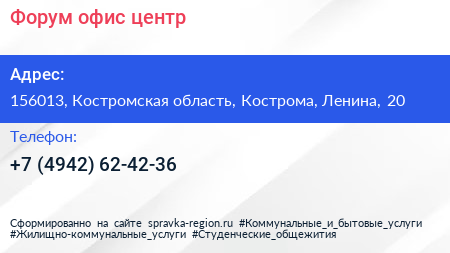 Форум, офис-центр по адресу 156013, Костромская область, Кострома, Ленина, 20 в дальнейшем Организация, размещена в следующих категориях: