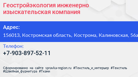 Геостройэкология, инженерно-изыскательская компания по адресу 156013, Костромская область, Кострома, Калиновская, 56а в дальнейшем Организация, размещена в следующих категориях: