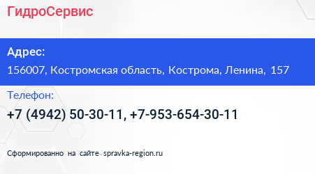 ГидроСервис по адресу 156007, Костромская область, Кострома, Ленина, 157 в дальнейшем Организация, размещена в следующих категориях: