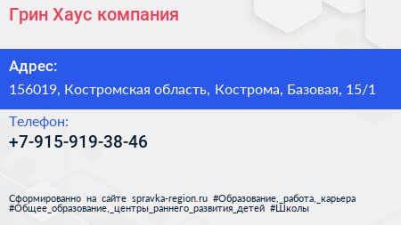 Грин Хаус, компания по адресу 156019, Костромская область, Кострома, Базовая, 15/1 в дальнейшем Организация, размещена в следующих категориях: