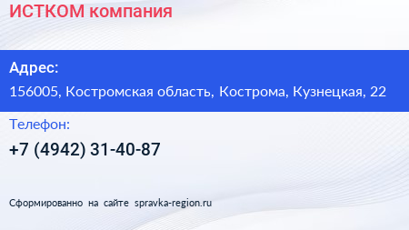 ИСТКОМ, компания по адресу 156005, Костромская область, Кострома, Кузнецкая, 22 в дальнейшем Организация, размещена в следующих категориях: