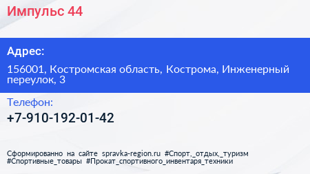 Импульс 44 по адресу 156001, Костромская область, Кострома, Инженерный переулок, 3 в дальнейшем Организация, размещена в следующих категориях: