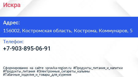 Искра по адресу 156002, Костромская область, Кострома, Коммунаров, 5 в дальнейшем Организация, размещена в следующих категориях: