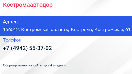 Костромаавтодор по адресу 156012, Костромская область, Кострома, Костромская, 61 в дальнейшем Организация, размещена в следующих категориях: